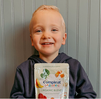 Our baby boy, born at 25 weeks, was not able to improve with bottle drinking and his intake reduced dramatically. To keep growing and avoid the constant stress of a wiggly infant pulling the NG tube, our care team decided it was time for a g-tube. We have had tube feeds since and work every day to improve. Since starting daycare, he has inched forward with oral meals. At home we supplement with Compleat® tube feeds to ensure growth. We just turned 2, and are nearing adjusted age 2 which means less of a need for milk, and just maybe thanks to Compleat®, our sweet boy’s tube journey is nearing an end as he eats and explores new foods every day.