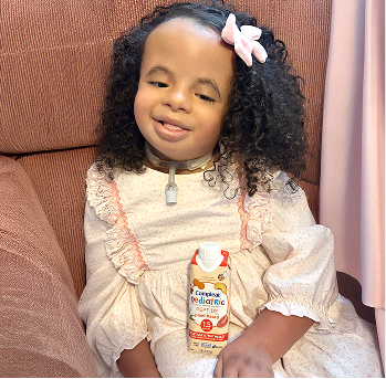 Miah has had feeding difficulties since birth & had an NG tube for 6 months then had a G-tube surgically placed. All of her nutrition has been via tube. She was diagnosed with pediatric feeding disorder after 2 years of being tube fed. She dealt with so much vomiting and her body rejected formula after formula until we switched to Compleat® almost 3 years ago! Since switching we have inched our way from refusing to touch foods, to accepting small tastes, to now getting 1-2 meals by mouth! It has been truly amazing to see her resilience and her growth with Compleat® on our side to offer us versatility & flexibility to use via tube or by mouth as we work to transition her to being less tube dependent!