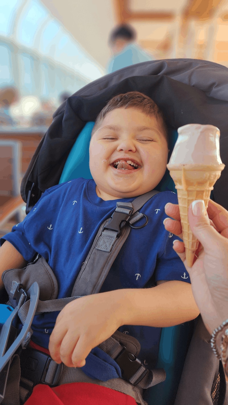 Max was born with congenital heart disease and had a heart transplant at a year old. Due to his heart condition he struggled to eat by mouth and he's had a feeding tube his entire life- and he's been on Compleat® for most of that time. He's been able to grow and thrive on his Compleat® Organic Blends, and with as many health concerns as he has- I'm thankful what he's fed with isn't one of them! Although he's 100% tube fed, he does enjoy one thing....ice cream!! On our recent family cruise, he enjoyed many licks of ice cream cones- and it was so awesome to see!